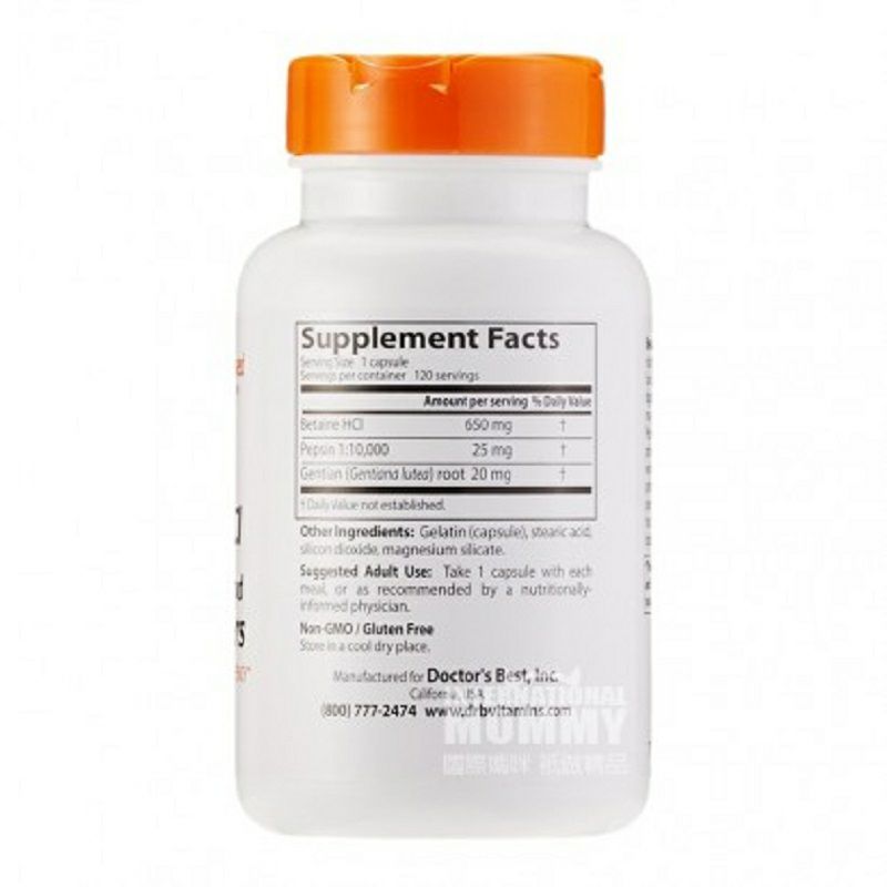 Parameters Applicable population: Adults Ingredients: Betaine, HCI, pepsin, gentian, gelatin, stearic acid, magnesium stearate, silica. Usage and dosage: 1 tablet per meal Specification: 120 Capsules / bottle matters needing attention: 1. Do not place it out of the reach of children 2. Please store in a dry place away from light and below 25 ℃. 3. If you are taking prescription drugs, have any physical condition, or are pregnant or lactating, please consult your doctor before taking this product. |