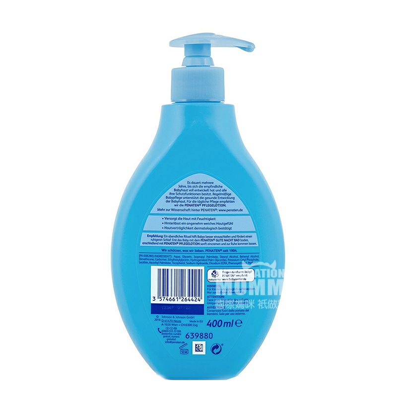 製品パラメータ 純含有量: 400 ml 適用年齢:新生児以上 使用方法:夜に塗ってマッサージして、赤ちゃんにもっと快適な睡眠を与えることができます。赤ちゃんが入浴した後、本品の適量を取って、赤ちゃんの全身を軽く塗って吸収するまで柔らかくマッサージします。 主成分:水、グリセリン、パルミチン酸イソプロピル、ステアリルアルコール、ジメトポリシロキサン、カポム、エチルヘキシルグリセリン、ハイドロパルミチングリセリン、ヘキサデシルリン酸カリウム、レシチン、アスコルビン酸パルミチン酸エステル、トコフェロール、水酸化ナトリウム、EDTA二ナトリウム、フェノキシエタノール、香水 注意事項: 1、子供が触れるところに置かないでください。 2、避光、乾燥所に保管してください。 3、製品が不注意で目に入ったら、すぐに大量の水できれいに洗ってください。 販売地:Germany/ドイツ ブランド:PENATEN/ベナティン |