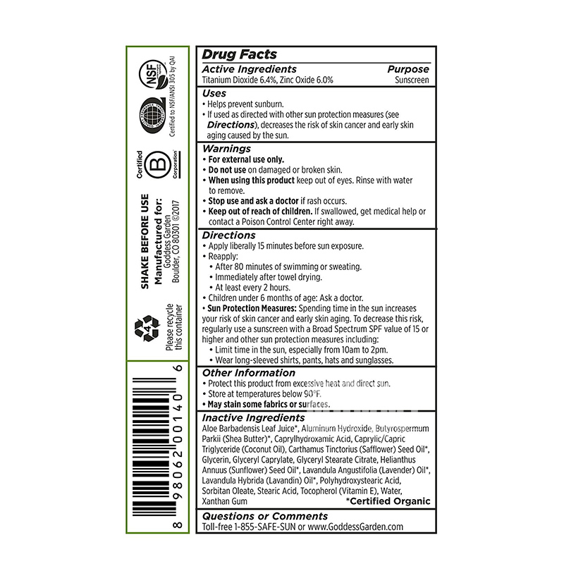Parameters製品パラメータ 適用肌質:すべての肌質 純含有量: 170 g 使用方法:日焼け前15分に十分な量をとり塗布します。水泳や汗をかいたらタオルで拭いてすぐに塗ります。少なくとも2時間ごとに1回使用します。 注意事項: 1、誤食を避けるために乳幼児が取れないところに置いてください。 2、使用後に何らかの不快感や持続的な赤腫がある場合は、直ちに使用を中止し、専門医に相談しなければならない。 3、皮膚敏感者は使用前に局所皮膚敏感性テストを行い、テスト後に刺激性反応がなくてから使用してください。 4、保存方法:は日陰で直接日光を照射しないでください。 5、皮膚に傷がある場合は使用しないでください。 販売地:America/アメリカ ブランド:goddess garden |