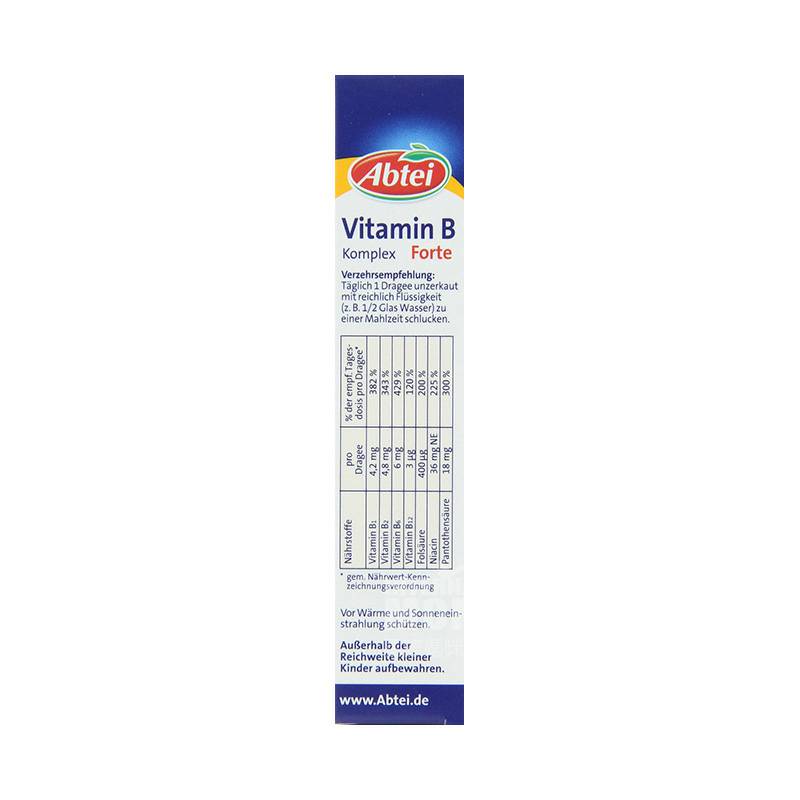 Parameters製品パラメータ 栄養情報 部分の大きさ: 1枚 チオアミン: 4.2 mg(381.82%NRV) ニコチン酸: 36 mg(225%NRV) ビタミンB 6 : 6 mg(428.57%NRV) 葉酸: 400マイクログラム(200%NRV) ビタミンB 12 : 3マイクログラム(120%NRV) 汎酸: 18 mg(300%NRV) 主要成分:ビタミンB族(B 1、B 2、B 6、B 12);葉酸ニコチン酸汎酸 純重量: 42 g 使用方法:は1日1-2粒、食事とともに温水で服用する。 適用者 1.虚弱、疲れ、イライラ、気分が落ち込み、緊張、ストレスを感じる人に適用します。 2.胃腸のエネルギー不足、蠕動無力、消化機能の低下、消化液分泌不良の人に適用する。 3.便秘、口臭、下痢、認知症、偏頭痛、フケの増加、脚気病のある人に適用します。 4.視力疲労、角膜充血、オーバーフロー性皮膚炎、天然痘またはニキビのある人に適用する。 5.たばこをよく吸ったり、お酒をよく飲んだり、薬を長期にわたって服用している人に適用します。 注意事項 1.妊婦が使用する前に医師に相談してください。 2.子供が触れる場所に置かないでください。 3.光を避け、乾燥させ、25度以下に保管してください。 4.副作用がある場合は、直ちに服用を中止し、医師に相談してください 販売地:Germany/ドイツ ブランド:Abtei |