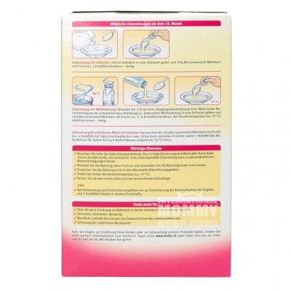 Features 產品特點 1、專為10個月以上的寶寶定制的完整的營養餐,提供日常所需要的營養。 2、富含有助於消化的纖維,預防寶寶便秘。 3、含水果原料,含有豐富的維生素,增強寶寶免疫力。 4、美味的麥片是非常細小的碎片,適合練習咀嚼的寶寶。 5、含有豐富的維生素B1幫助神經系統的發育。 6、有機生產,無任何添加,健康。