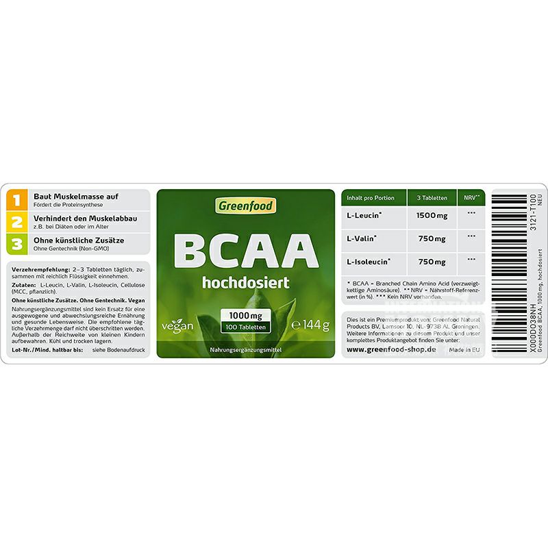 Parameters Applicable population: Adults Ingredients: L-leucine (500 mg), L-valine (250 mg), L-isoleucine (250 mg), methylcellulose (HPMC, MCC), calcium carbonate. Usage and dosage: 2-3 capsules per day Net content: 144g Specification: 100 pieces matters needing attention: 1. Do not place it out of the reach of children 2. Please store in a dry place away from light and below 25 ℃. 3. If you are taking prescription drugs, have any physical condition, or are pregnant or lactating, please consult your doctor before taking this product. Place of sale: Netherlands Brand: Greenfood |