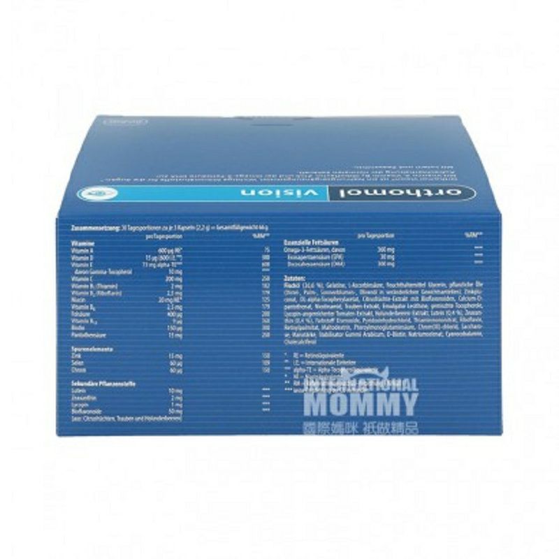 Parameters Applicable population: Adults Specification: capsule, 30 packs / box Main ingredients: fish oil, gelatin, L-ascorbic acid, glycerin, vegetable oil, zinc gluconate, DL - α - tocopherol acetate, bioflavonoids extracted from citrus fruits, calcium D, calcium pantothenate, nicotinamide, red grape extract and polyphenols, emulsifier, lecithin, mixed tocopherol, lycopene enriched tomato extract, elderberry extract and anthocyanins, yehuang 4%), zeaxanthin (0.2%), iron oxide pigment, pyridoxine hydrochloride, thiamine mononitrate, riboflavin, vitamin A palmitate, maltodextrin, chromium (III), sucrose chloride, corn starch, stabilizer gum Arabic, d-biotin, sodium selenate, cyanocobalamin, cholecalciferol. Usage: one bag a day, warm water after meals. matters needing attention: 1. This product should not exceed the recommended amount or be taken with the same kind of nutritional supplements at the same time; 2. Do not put it in the place that children can touch; 3. Please store in a dark, dry place with temperature no higher than 25 ℃; 4. This product is a dietary supplement and can't replace medicine; 5. Please take it under the guidance of your doctor. Pregnant women and children are not allowed to take it. Place of sale: Germany Brand: orthomol |