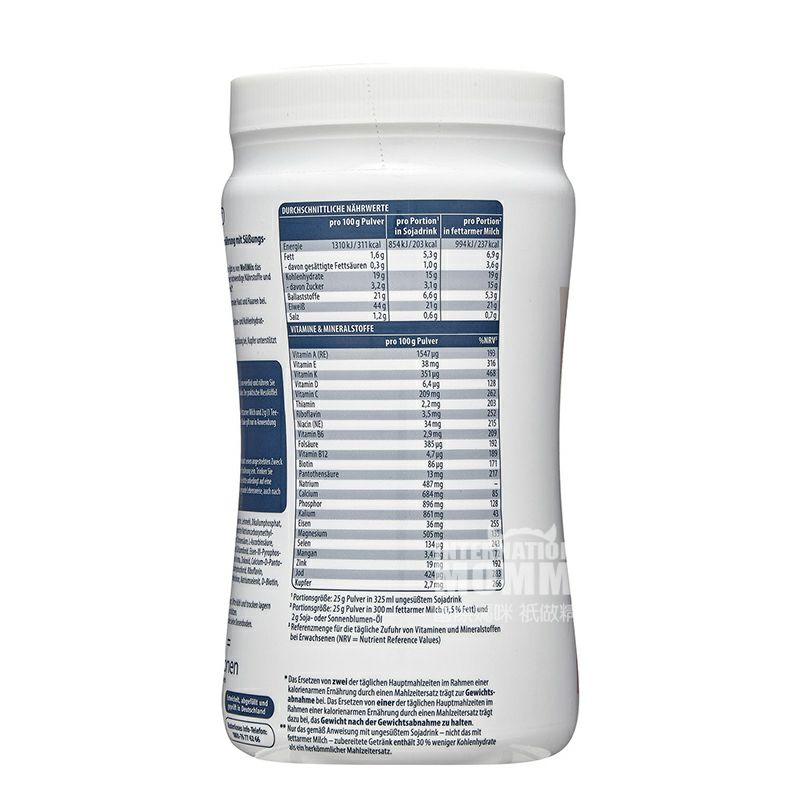 Parameters Suitable for: Adults Net content: 350g How to use: for one portion (equivalent to one meal), pour two teaspoons (25g) of powder into 325ml unsweetened soy beverage or 300ml low-fat milk. matters needing attention: 1. This product should not exceed the recommended amount or be taken with the same kind of nutritional supplements at the same time; 2. Do not put it in the place that children can touch; 3. Please store in a dark, dry place with temperature no higher than 25 ℃; Place of sale: Germany Brand: wellmix |