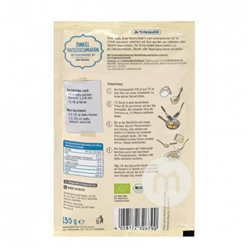 Parameters 產品參數 淨含量:135g 適用人群:2歲以上兒童及成人 成分:62%斯佩爾特小麥,蔗糖 11.1%,雞蛋,發酵粉(玉米澱粉,酒石酸鉀,碳酸氫鈉),海鹽,香草 過敏信息:含有雞蛋和谷蛋白的穀物 食用方法:開袋即食,兒童需大人陪同下食用。 儲藏方法:避光儲藏,置於陰涼乾燥處。 銷售地: Germany 品牌:dmBio |