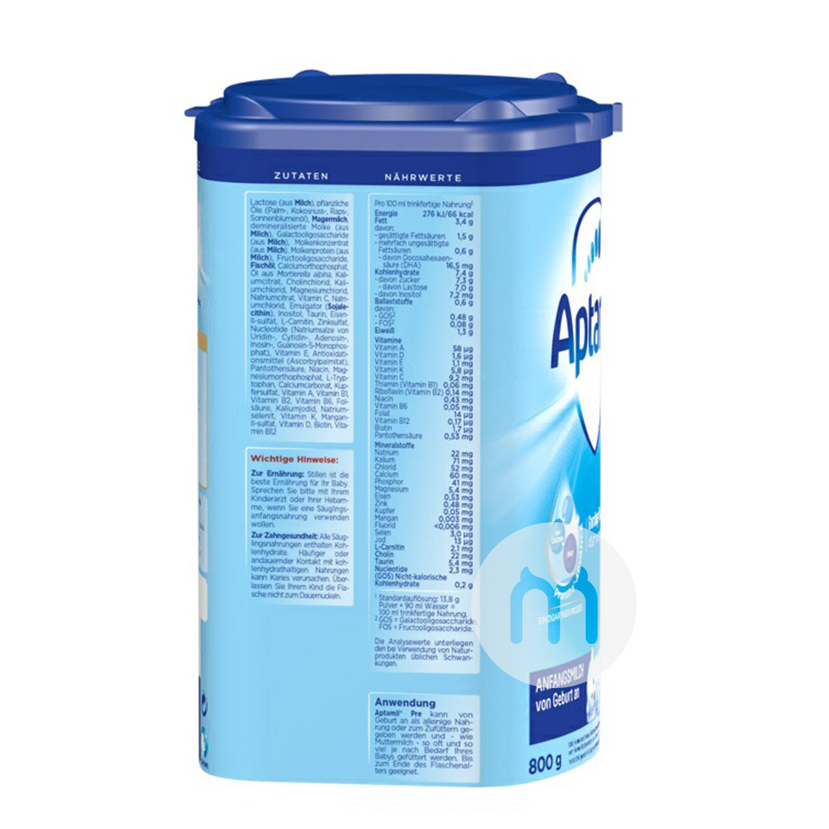 Parameters Suitable age: 0-6 months Stage: pre segment Net content: 800g Main ingredients: calories, fat, carbohydrate, sugar, dietary fiber, protein, vitamins, folic acid, minerals matters needing attention: 1. However, all formula changes need to be converted to milk. For example, milk needs to be transferred from the first stage to the second stage, and from the old formula to the new formula, 2. Do not transfer milk for one week before and after vaccination; 3. Do not transfer milk when baby is not well; 4. During the transfer period, if the baby does not adapt, it is necessary to extend the adaptation period until it adapts; 5. Do not add new complementary food during milk transfer. Place of sale: Germany Brand: Aptamil |