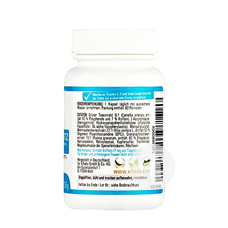 Parameters Main ingredients Pure natural quality without additives! new trend! Continuous inspection and analysis to ensure purity! The vihado quality brand comes from Germany! Product Efficacy It is used to protect cells and prevent DNA and aging damage caused by oxidative stress and free radicals. The vitamins B2, C, E and selenium help prevent oxidative stress in cells! In addition to the precious grape seed OPC, the native extract of pomegranate + green tea! Applicable people Suitable for adults Dosage: Take 1 capsule per day with plenty of water Notes 1. This product is a nutritional product and cannot be taken as a substitute for medicine. 2. Do not exceed the recommended daily dose. 3. Please put this product out of the reach of children. 4. Store in a cool, dry place away from direct sunlight. 5. Pregnant and breast-feeding women should consume it according to the doctors instructions. Specification 60 capsules/box Sales Location: Germany Brand: vihado |