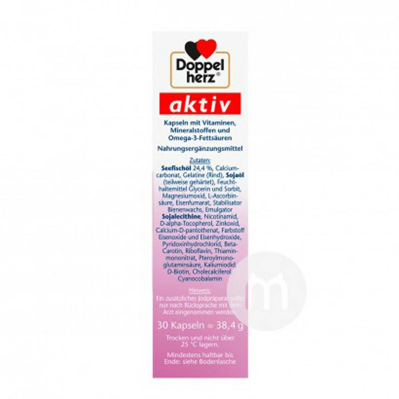 Bahan: 24,4% minyak ikan laut, kalsium karbonat, gelatin (sapi), kedelai (terhidrogenasi sebagian), gliserin dan sorbitol pelembab, magnesium oksida, asam L-askorbat, fumarate besi, stabilisator lilin lebah, pengemulsi telur kedelai Fosfolipid, nikotinamid, D-α-tokoferol, seng oksida, kalsium D-pantotenat, pewarna besi oksida dan besi hidroksida, piridoksin hidroklorida, β-karoten, riboflavin, tiamin mononitrate, basa Asam monoglutamat, kalium iodida, D-biotin, cholecalciferol, cyanocobalamin. Cara minum: Minum 2 kapsul sehari dengan air hangat. Hal-hal yang perlu diperhatikan: 1. Jika Anda mengalami alergi selama penggunaan, silakan mencari saran medis. 2. Harap ikuti instruksi dengan ketat, dan jangan dianggap berlebihan. 3. Jangan letakkan di luar jangkauan anak-anak. 4. Harap simpan di tempat yang gelap, kering, tidak lebih tinggi dari 25 derajat Celcius. Tempat penjualan: Jerman Merek: Doppel herz |