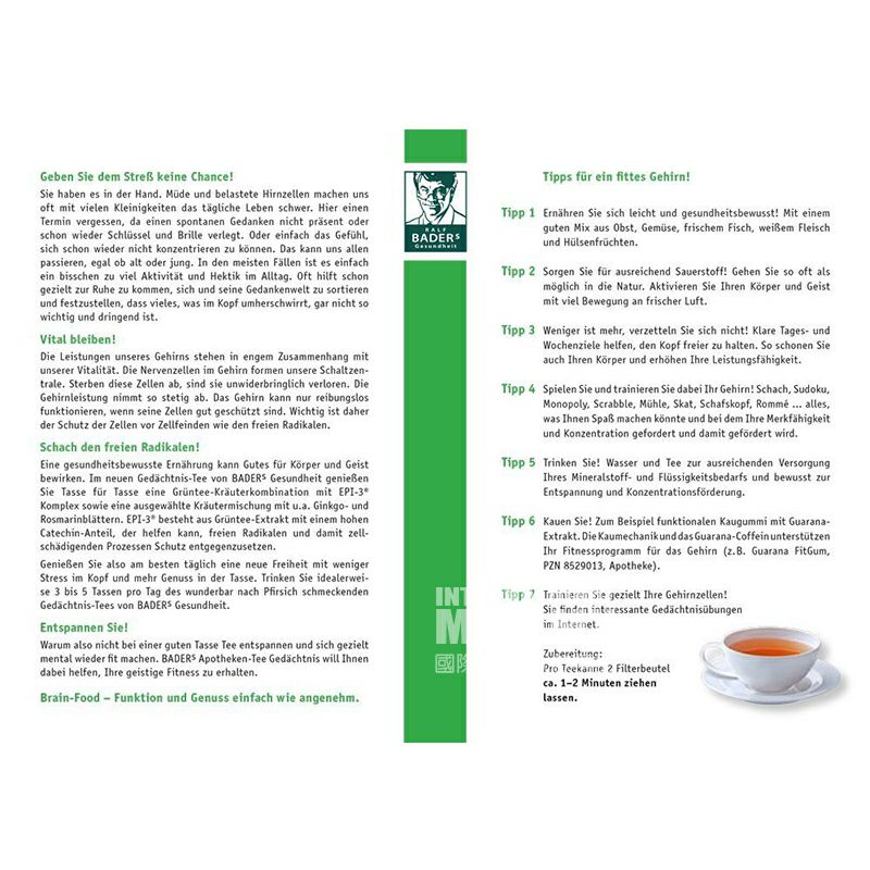 Spesifikasi: 20 kantong / kotak Bahan: Teh Hijau, Daun Balsem Lemon, Daun Jeruk, Ekstrak Teh Hijau, Peach Harum, Daun Ginkgo, Lavender, Daun Rosemary Orang yang berlaku: orang dewasa Cara mengambil: 2 kantong teh per teko, dapat diminum dalam 1-2 menit. Kiat: 1. Jangan letakkan di luar jangkauan anak-anak 2. Silakan simpan di tempat yang gelap dan kering, simpan di bawah 25 ℃. 3. Jika Anda menggunakan obat resep, memiliki kondisi fisik, atau sedang hamil dan menyusui, silakan berkonsultasi dengan dokter Anda sebelum mengambil produk ini. Negara asal: Jerman / Jerman Merek: RALF BADERs Gesundheit |