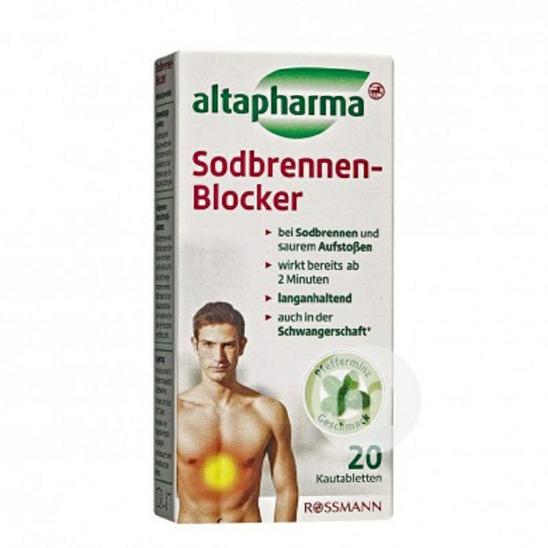 1 tablet mengandung: bahan aktif: ekstrak ganggang coklat Eksipien: natrium bikarbonat, kalsium karbonat, trikalsium fosfat, magnesium stearat, zat penyedap peppermint, sorbitol, sucralose, selulosa mikrokristalin. Spesifikasi: 20 lembar / kotak Cara minum: Dewasa dan anak-anak di atas 12 tahun: 2 sampai 4 kapsul setelah makan dan gejala sebelum tidur. Tidak lebih dari 16 kapsul per hari. Metode penyimpanan: Simpan di tempat yang kering, dingin, dan gelap. Tempat penjualan: Jerman Merek: altapharma |
