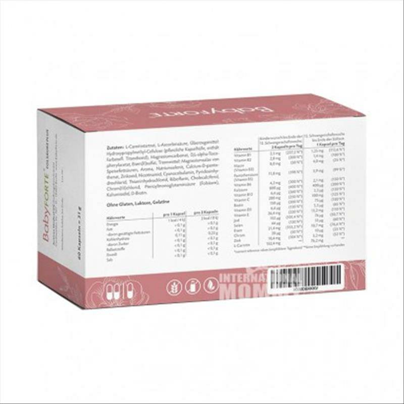 Orang yang berlaku: wanita selama kehamilan dan menyusui Spesifikasi: Kapsul, 60 kapsul / kotak Bahan utama: L-karnitin tartrat, asam L-askorbat, zat pelapis: hidroksipropil metil selulosa (cangkang kapsul sayuran mengandung zat pewarna: titanium dioksida), magnesium karbonat, d, L-α-tocopheryl acetate , Ferrous sulfate, zat pemisah: magnesium stearate, rasa, natrium selenite kalsium d-pantothenate, zinc oxide, nicotinamide, vitamin B12, pyridoxine hydrochloride, thiamine hydrochloride, riboflavin , Cholecalciferol, chromium (III), Pteroylmonoglutaminsäure yang diklorinasi (asam folat), potassium iodide, d-biotin. Penggunaan: Dari kehamilan hingga akhir minggu ke-12 kehamilan, 2 kapsul per hari, dari minggu ke-13 kehamilan hingga akhir laktasi, 1 kapsul per hari. Hal-hal yang perlu diperhatikan: 1. Dosis harian yang disarankan tidak boleh dilampaui. 2. Suplemen makanan tidak bisa menggantikan makanan yang seimbang dan bervariasi. 3. Simpan di tempat yang sejuk dan kering, jauh dari jangkauan anak-anak. Tempat penjualan: Jerman Merek: BabyFORTE |