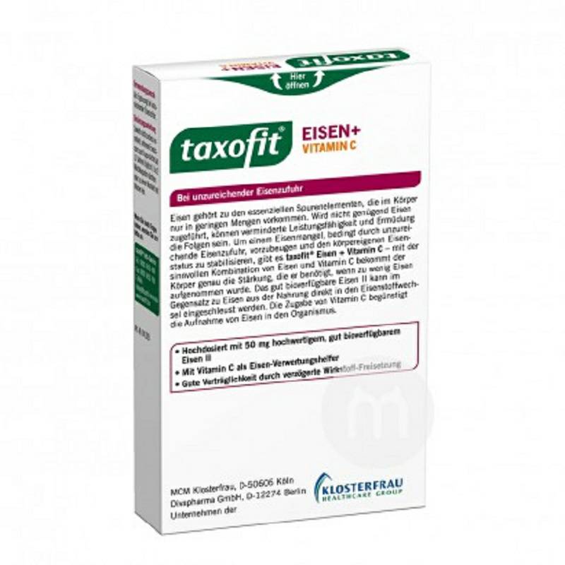 Bahan aktif: ferrous sulfate H2O X Cara minum: Ambil secara lisan. Harap baca sisipan paket dan konsultasikan dengan dokter atau apoteker Anda. Spesifikasi: 40 kapsul / kotak Orang yang berlaku: dewasa Hal-hal yang perlu diperhatikan: 1. Produk nutrisi tidak dapat menggantikan diet yang komprehensif dan bervariasi. 2. Hindari kontak dengan anak-anak. 3. Simpan di tempat yang sejuk dan kering. Negara asal: Jerman Merek: taxofit |