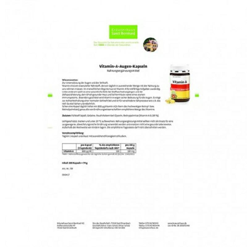 Bahan: Minyak kedelai diisi, gelatin, gliserin pelembab, retinyl palmitate (Vitamin A 0,189%). Orang yang berlaku: dewasa Spesifikasi: 180 kapsul Cara menggunakan: Minum 1 kapsul setiap hari dengan banyak air. Hal-hal yang perlu diperhatikan: 1. Produk nutrisi tidak dapat menggantikan diet seimbang dan gaya hidup sehat. 2. Hindari sinar matahari langsung selama penyimpanan. 3. Produk ini tidak digunakan untuk mendiagnosis, mendiagnosis atau mencegah penyakit apa pun. Tempat penjualan: Jerman Merek: Sanct Bernhard |