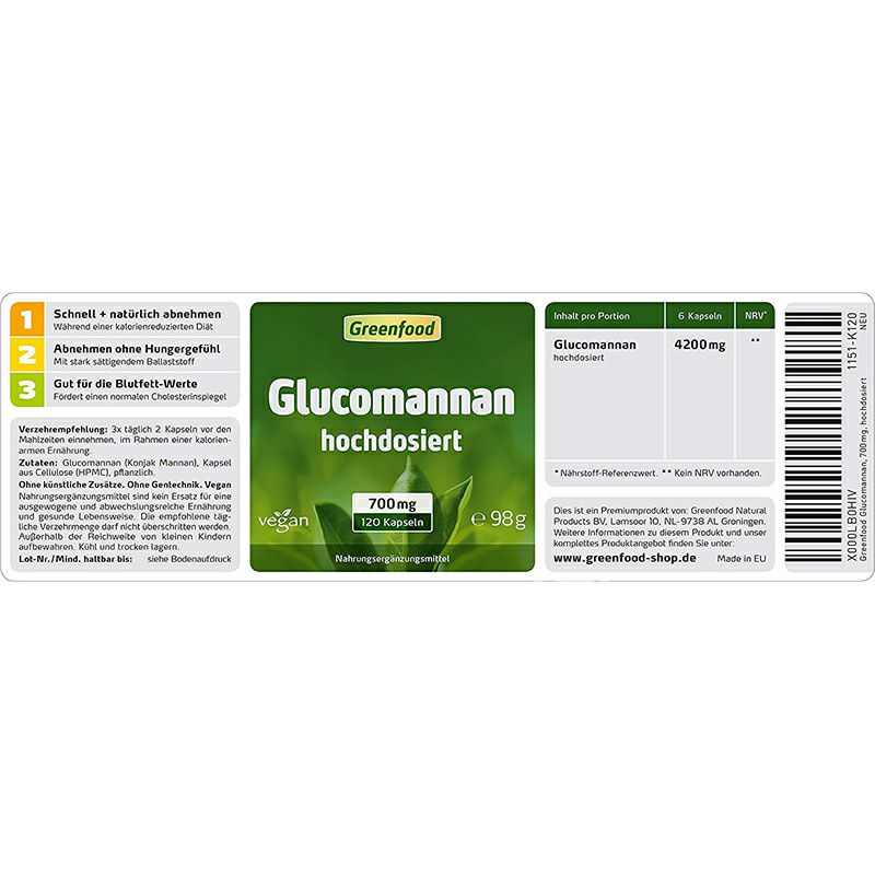 Fitur Produk 1. 1 kapsul = 700 mg glukomanan, dosis tinggi. 2. Sebagai serat makanan, glukomanan tidak diserap, tidak mengandung kalori, memiliki rasa kenyang, dan dapat mengurangi dan menunda penyerapan glukosa. Glukomanan secara efektif mengurangi terjadinya kelaparan. 3. Glukomanan adalah suplemen serat makanan berdasarkan konjac glukomanan, sehingga merupakan suplemen untuk diet Anda. 4. Tidak ada aditif buatan (tidak ada magnesium stearate, dll.), Tidak ada gluten, tidak ada laktosa, kapsul vegetarian.