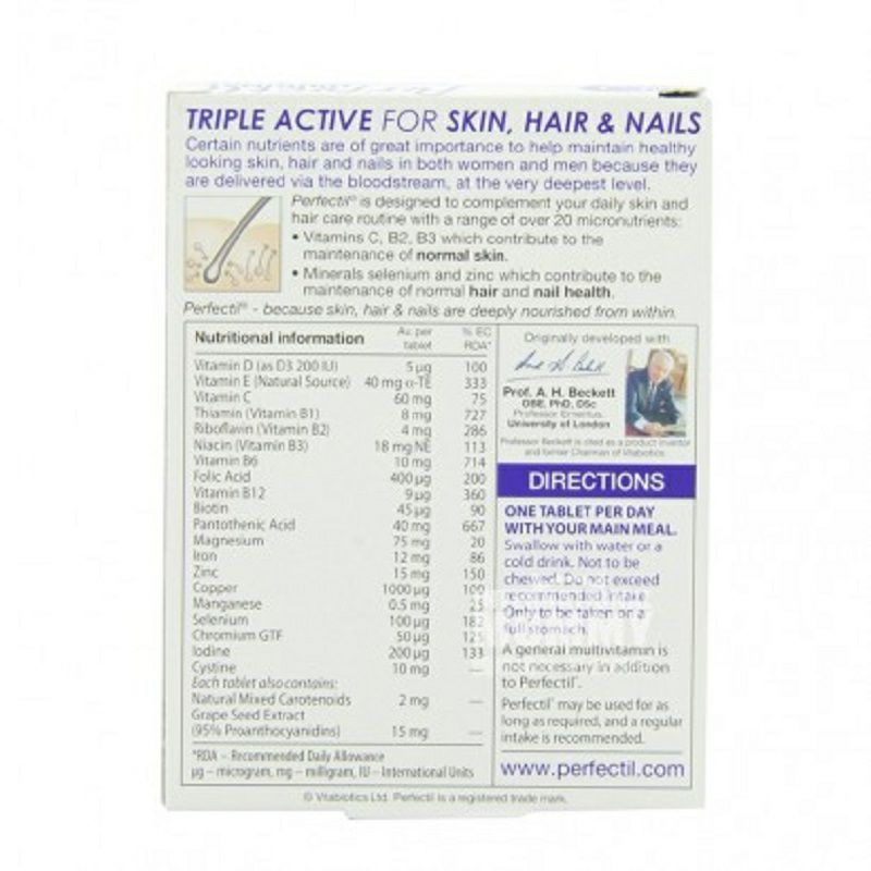 Bahan: Vitamin B6 (pyridoxine hydrochloride), ekstrak biji anggur, vitamin D3 (cholecalciferol, trigliserida rantai menengah, koloid silikon dioksida, talang halus, maltodekstrin, BHA, etil selulosa), wortel (Β-karoten, pati termodifikasi, natrium askorbat, pati jagung, sirup glukosa, antioksidan: DL-α-tokoferol), vitamin B12 (Cyanobalamin, [pembawa: dicalcium fosfat]), riboflavin, asam sulfat Mangan, koenzim Q10, tembaga sulfat, asam folat (seperti asam Pteroylmonoglutamat), natrium selenat, kalium iodida, kromium triklorida, biotin. Orang yang berlaku: dewasa Spesifikasi: 30 tablet Cara menggunakan: Minum 1 tablet setiap hari dengan makanan. Hal-hal yang perlu diperhatikan: 1. Produk nutrisi tidak dapat menggantikan diet seimbang dan gaya hidup sehat. 2. Hindari sinar matahari langsung selama penyimpanan. 3. Produk ini tidak digunakan untuk mendiagnosis, mendiagnosis atau mencegah penyakit apa pun. Tempat penjualan: Inggris Merek: Vitabiotik |