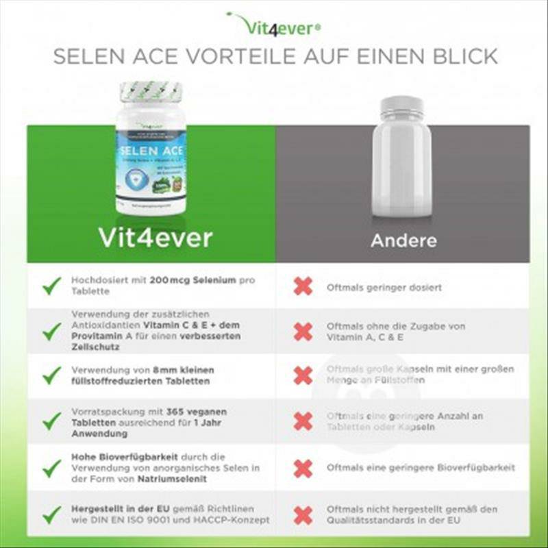 Bahan: sodium selenite, retinyl acetate, tocopheryl acetate, asam askorbat, bantuan filter dan zat pemisah: selulosa mikrokristalin, garam magnesium asam lemak, silikon dioksida. Orang yang berlaku: dewasa Spesifikasi: 365 tablet / botol Cara menggunakan: Disarankan untuk mengambil 1 tablet setiap hari dan menelannya dengan banyak air. Hal-hal yang perlu diperhatikan: 1. Jangan letakkan di luar jangkauan anak-anak. 2. Silakan simpan di tempat yang gelap dan kering, simpan di bawah 25 ℃. 3. Jika Anda menggunakan obat resep, memiliki kondisi fisik, atau sedang hamil atau menyusui, silakan berkonsultasi dengan dokter Anda sebelum mengambil produk ini. Tempat penjualan: Jerman Merek: Vit4ever |