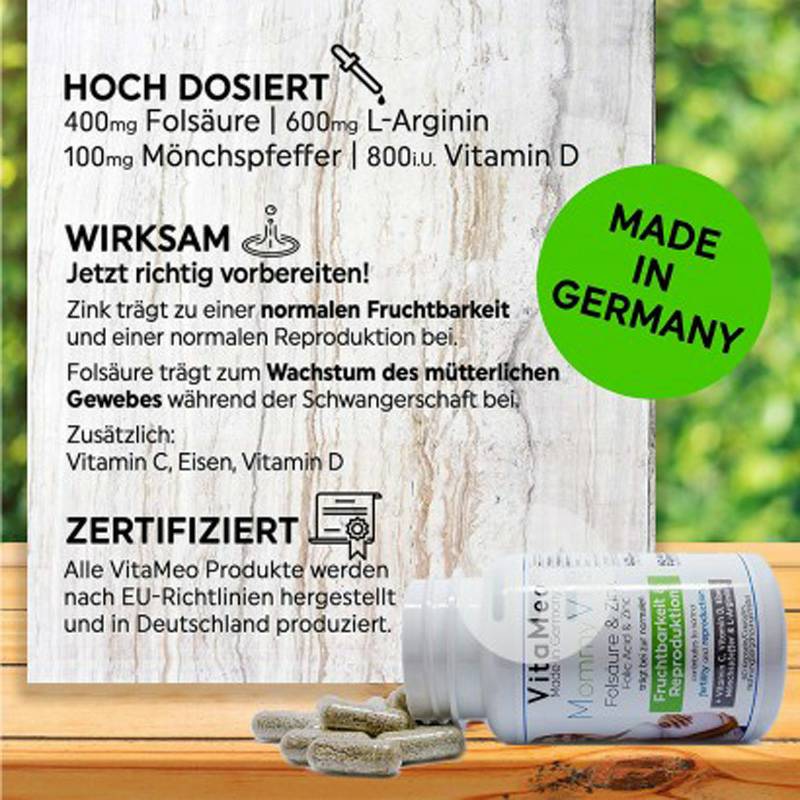 Bahan: L-Arginine, Vitamin C, batu permata Mönchspfe, gelatin, sitrat besi, seng sitrat, asam folat, agen pelepas cetakan. Serbuk minyak MCT, vitamin D3. Spesifikasi: 60 kapsul Orang yang berlaku: wanita Cara menggunakan: Ambil 2 kapsul setiap hari dengan air hangat. Hal-hal yang perlu diperhatikan: 1. Jangan letakkan di tempat yang bisa dijangkau anak-anak; 2. Simpan pada suhu kamar (hingga 25 ° C); 3. Tutup botol dengan hati-hati setelah setiap penggunaan dan simpan botol yang dibuka dengan tegak; 4. Suplemen makanan tidak bisa menggantikan makanan yang bervariasi dan seimbang. Tempat penjualan: Jerman Merek: VitaMeo |