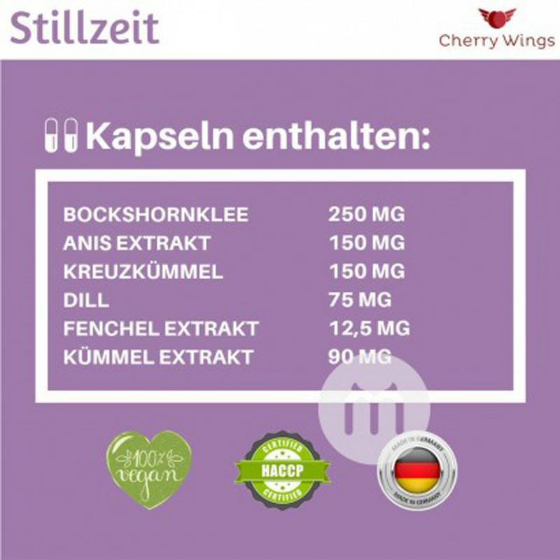 Bahan: Fenugreek, ekstrak adas, jinten, ekstrak jintan, adas, ekstrak adas, cangkang kapsul: serat tanaman, bahan pelepasan jamur: ekstrak bekatul. Spesifikasi: 60 kapsul Orang yang berlaku: ibu menyusui Cara menggunakan: Ambil 2 kapsul setengah jam sebelum makan dengan air hangat. Hal-hal yang perlu diperhatikan: 1. Jangan letakkan di tempat yang bisa dijangkau anak-anak; 2. Simpan pada suhu kamar (hingga 25 ° C); 3. Tutup botol dengan hati-hati setelah setiap penggunaan dan simpan botol yang dibuka dengan tegak; 4. Suplemen makanan tidak bisa menggantikan makanan yang bervariasi dan seimbang. Tempat penjualan: Jerman Merek: Cherry Wings |