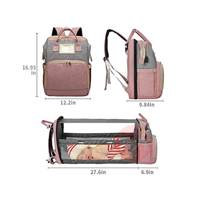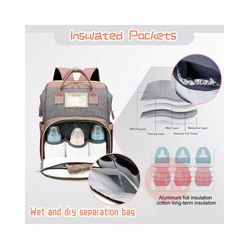 Fitur Produk 1. Fashion dan kapasitas besar: Seluruh paket memiliki 14 ruang penyimpanan, yang dapat menyimpan produk bayi seperti popok, susu bubuk, botol susu, saputangan, handuk, mainan, pompa ASI, dan produk perawatan bayi. Ada juga ruang desain untuk orang tua, seperti ponsel dan tablet. Komputer, daya ponsel, pemutar MP3, berbagai kartu. 2. Ransel tas popok dengan tempat tidur bayi: tidak hanya ransel ibu, dapat dengan mudah menjadi tempat tidur lipat, dilengkapi dengan bantalan popok yang lembut, Anda dapat mengganti popok kapan saja, di mana saja atau membiarkan bayi Anda berbaring. Bagian kain peneduh dapat menghalangi sinar matahari yang kuat dan daun yang jatuh, memberikan tempat yang tenang, higienis, dan nyaman untuk bayi.3. Buatan tangan, tahan air dan mudah dibersihkan: Tas popok kami dijahit tangan dengan bahan kain tahan air 900D terbaru untuk memastikan tas popok kami kuat dan tahan lama. 4. Desain antarmuka produk elektronik: jack earphone dan antarmuka pengisian USB ditambahkan di sisi kiri tas popok.