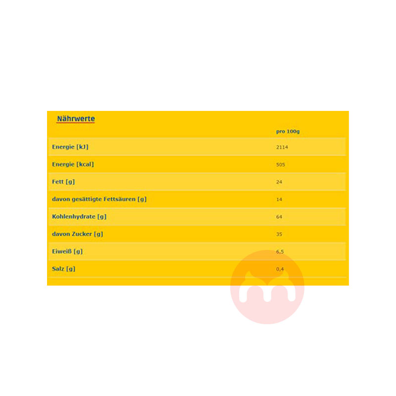 Bahan: tepung terigu, gula, cocoa butter, massa kakao, minyak sawit, susu bubuk utuh, sirup glukosa, sirup karamel, susu bubuk skim, lemak mentega, kayu manis, garam, produk whey (susu), bahan pengembang: natrium karbonat , Difosfat ; Pengemulsi: Lesitin; Rempah-rempah, zat penyedap (susu), kemiri tanah, pati (gandum), acidulant: asam sitrat; Telur bubuk. Informasi alergen: sereal yang mengandung gluten, gandum, kacang pohon, telur, susu, hazelnutSpesifikasi: 24 * 28g Cara makan: Buka tas dan makan Metode penyimpanan: Simpan di tempat yang kering, hindari panas. Tempat penjualan: Jerman Merek: Leibniz
