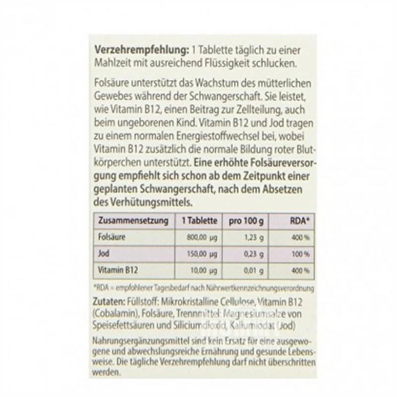Bahan utama: Selulosa mikrokristalin, vitamin B12 (cobalamin), asam folat, zat pemisah: magnesium stearat dan silikon, kalium iodat (iodin.) Khasiat: Tingkatkan tingkat pembuahan, cegah deformitas bayi, kurangi reaksi kehamilan dini dan tingkatkan kekebalan bayi Orang yang berlaku: wanita Penggunaan dan dosis: Minum 1 kapsul setiap hari dan telan dengan banyak air. Hal-hal yang perlu diperhatikan: Simpan pada suhu kamar (15-25 ℃) Harap jauhkan obat ini dari jangkauan anak-anak Wanita hamil, harap diminum sesuai petunjuk dokter Anda Konten bersih: 7.8g Spesifikasi: 120 kapsul / kotak Negara asal: Jerman Pabrikan: Avitale |