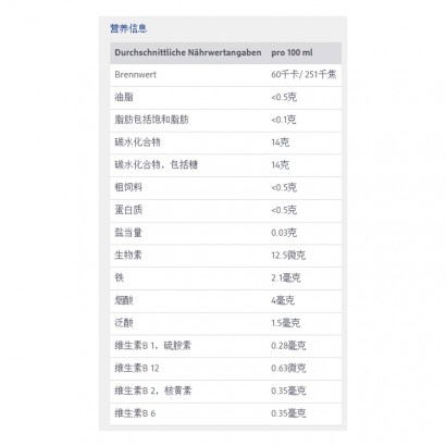 成分:白ブドウジュース、リンゴジュース、イチゴ泥、ナナカマドジュース、接骨木ジュース、ブルーベリージュース、鉄(II)、グルコース酸、ビタミンB 1、B 2、B 6、B 12、ニコチン酸、汎酸塩、バイオマス。