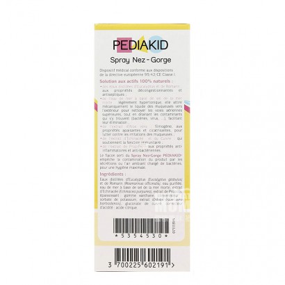 Parameters製品パラメータ は人の群れに適して: 2-10歳の赤ちゃん 純含有量: 20 ml/ボトル 使用方法: はフロントスイングを使用します。使用後、ノズルを水で洗います。 鼻はm−hを用いて各鼻孔に2〜3回、毎日2回、5日間連続して噴霧した。 のどは:を用いて喉に2回(30ヶ月以上の赤ちゃんでなければならない)噴霧し、毎日3-4回行う。5日間連続使用 成分:蒸留水、案樹水(青案)、死海の海水塩、迷畳香(迷畳香)抽出物、紫錐菊(松果)、銅、プロポリス抽出物。増粘剤:原ゴム。防腐剤:山梨酸カリウム、キサントゲル、アロエ(アロエアロエ)、グルコース酸銅。酸度調節剤:クエン酸。 注意事項: 1は、室温(15-25)で日光の照射を避ける。 2、子供が触れる場所に置かないでください。 販売地:France/フランス ブランド:PEDIAKID/ペディック |